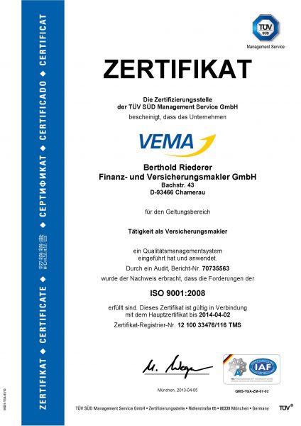 Wir sind seit 10.08.2012 zertifiziert nach DIN EN ISO 9001! An der Grenze entlang zwischen Weiden und Passau sind wir der einzige Versicherungsmaklerbetrieb, der diese Qualifikation aufweist!